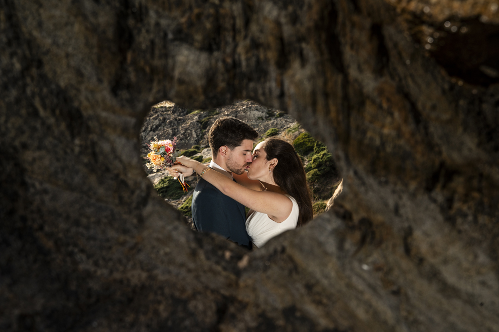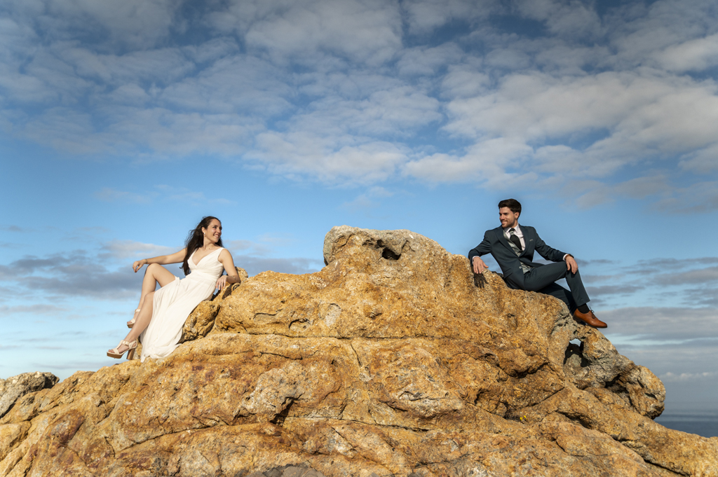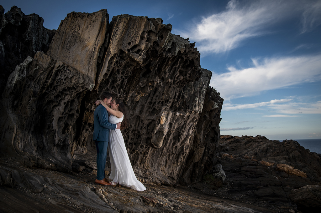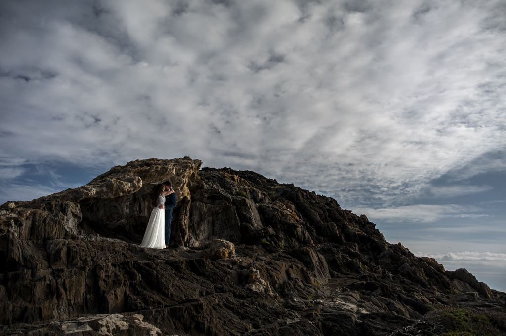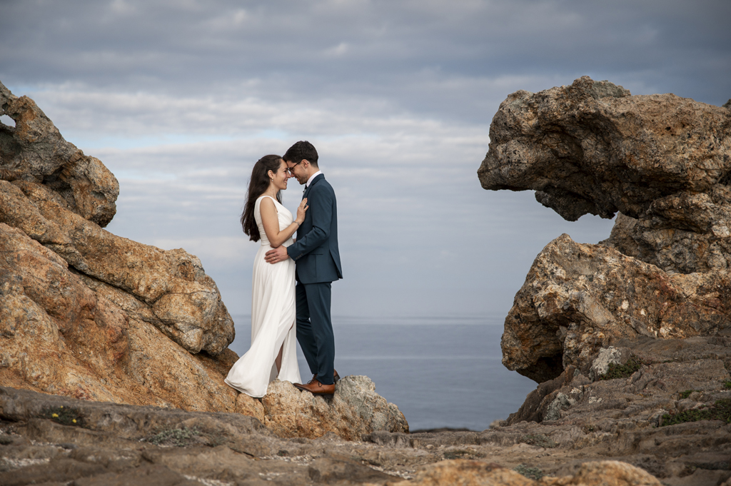 Georgina y Arnau se regalaron un rato más después de la boda. Una aventura entre rocas, mar y cielo abierto donde todos los rincones pedían una foto. Sin prisas, sin guion: solo ellos dos y un paisaje que invitaba a parar un momento y mirar alrededor.